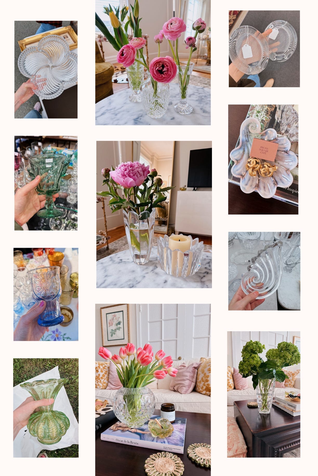 Living Room Wares – I’ve collected a mix of candle holders for votives, candlesticks, and 3–4” pillar candles. I’m always on the lookout for small catch-alls to corral small things like keys, matchbooks, pens, dainty jewelry, lipsticks, hair ties, palo santo, q-tips, and makeup brushes. I also love glass picture frames (though they’re a bit rarer). And one of my dream finds is a wine bottle coaster—I just haven’t stumbled on “the one” yet (something like this).