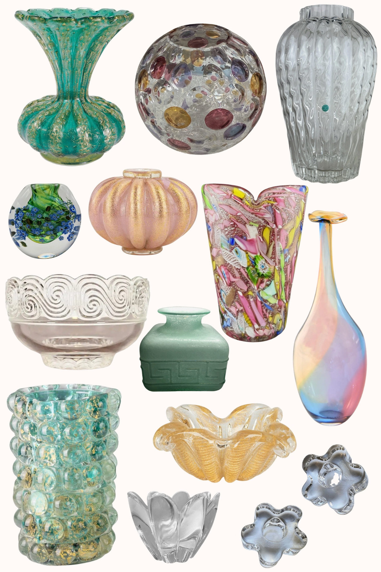 Millefiore – Means “a thousand flowers” in Italian. You’ll see tiny mosaic-like patterns in paperweights, bowls, and vases. How cute is this?